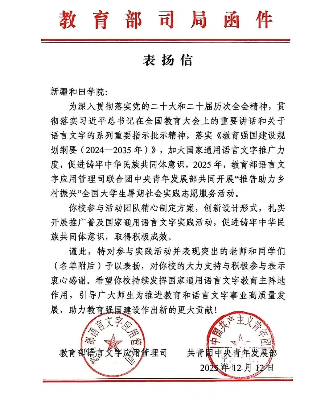近日,新疆和田学院收到教育部语言文字应用管理司与共青团中央青年发展部联合发来的表扬信,对新疆和田学院在2025年“推普助力乡村振兴”全国大学生暑期社会实践志愿服务活动中表现突出的团队予以表彰。由校团委与临床医学院共同组建的“医路有你”推普实践团队,凭借扎实的前期准备、创新的活动设计与显著的服务成效,在全国众多实践队伍中脱颖而出,荣获“优秀团队”称号。